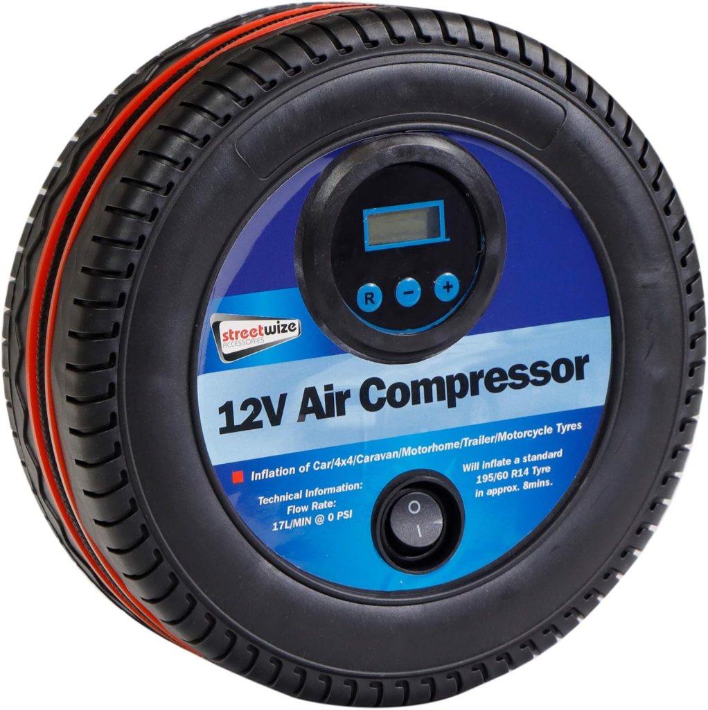 Dual-voltage inflator for car, van and truck tyres. Helps drivers manage slow leaks or top up pressures before leaving a RDC at night. Digital gauge, long cable, and rugged build.